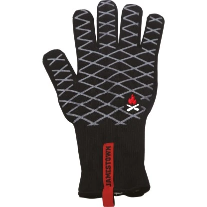 Der Jamestown Grillhandschuh schützt dich beim Grillen vor Verbrennungen. Dank der Ausführung als Fingerhandschuh hast du mehr Gefühl beim Greifen beispielsweise von Grillbesteck. Ausgestattet ist der schwarze Handschuh mit einer großzügig bemessenen Stulpe, die deutlich über das Handgelenk hinausragt. Die gummierte Oberfläche sorgt für den optimalen Halt beim Grillen. An der Schlaufe mit Jamestown-Logo lässt sich der Grillhandschuh einfach aufhängen. Er ist hitzebeständig bis 250° Celsius.