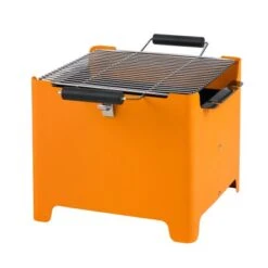 Zur einfacheren Reinigung in der Spülmaschine ist der Grillrost in der Mitte zusammenklappbar. Seitlich kann er zum Nachfüllen von Kohle während des Grillens hochgeklappt werden.