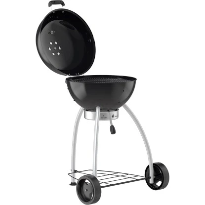 Grillkugel aus porzellanemailliertem Stahl in Schwarz. Stabiler Rohrrahmen aus Aluminium.